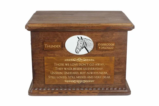 Jouw KWPN was geen doorsnee paard — en de urn mag dat laten zien. Voeg zijn of haar naam toe, een datum, een korte tekst of een pootafdruk. Neem gerust contact met ons op voor de mogelijkheden.