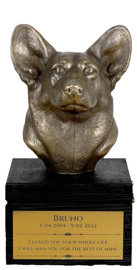 De Corgi heeft een warme, goudbruine kleur en een levendige uitstraling — een naturel houten urn of een keramische urn in warm oranje of goudbruin past prachtig. Bekijk ons aanbod via de links in dit artikel voor alle opties.